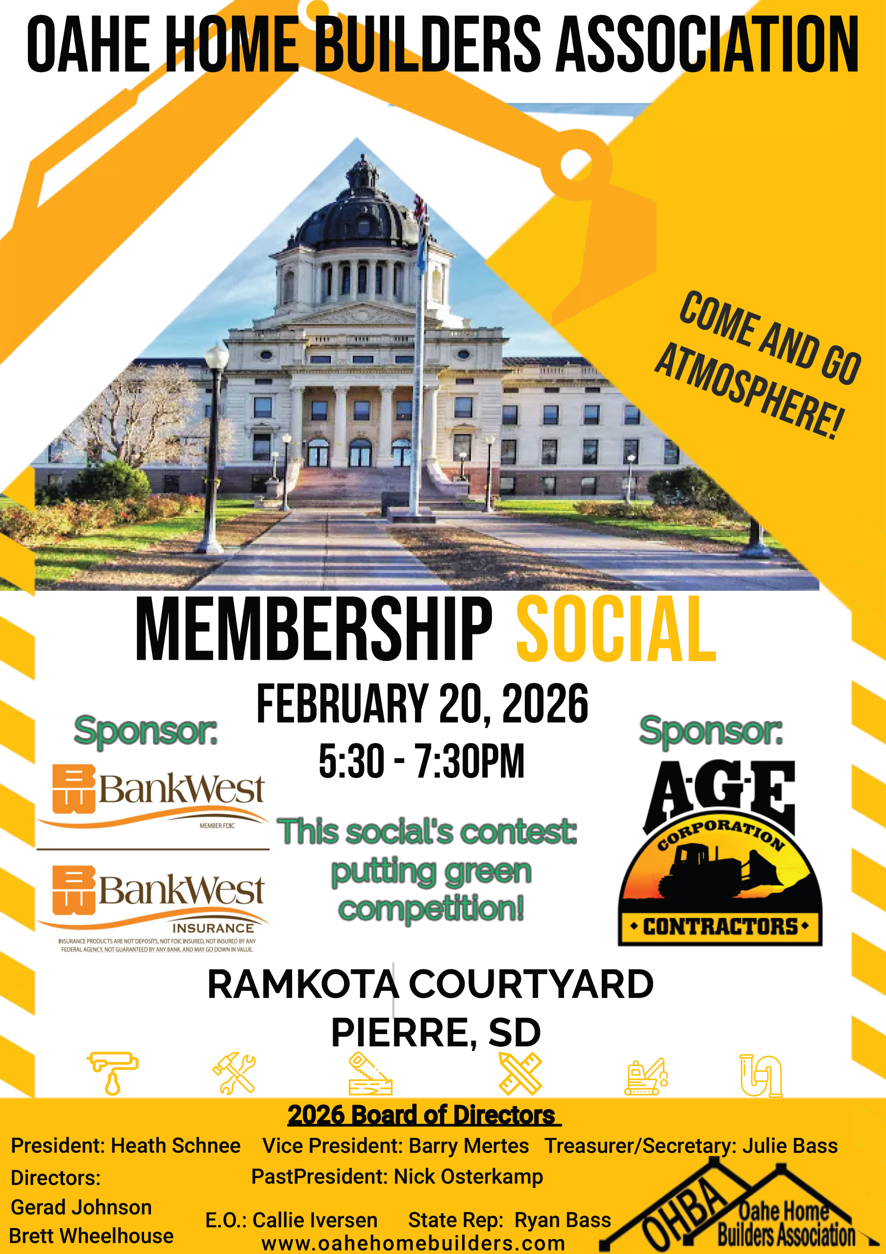 Oahe Home Builders Association provides it’s members with a 3-tier membership program. The first tier of membership is becoming a part of our surrounding communities through volunteer work, sponsorship dollars, fundraising events and keeping home ownership affordable by fighting legislation that continues to burden the home builders and owners. The second portion of the tier is being a member of The South Dakota Home Builders Association, a statewide non-profit trade association made up of professional builders, re-modelers, and associate members. Who also promote home ownership and quality affordable housing through active participation in industry related issues. The third tier is being a member at the National level with the National Home Builders Association, who work with states throughout our nation to keep the Home Building Industry and the consumers on top of key issues directly affecting all of us as a whole! Through this 3-tier membership, our members have access to education, training, legal advice, legislative and discounts available.